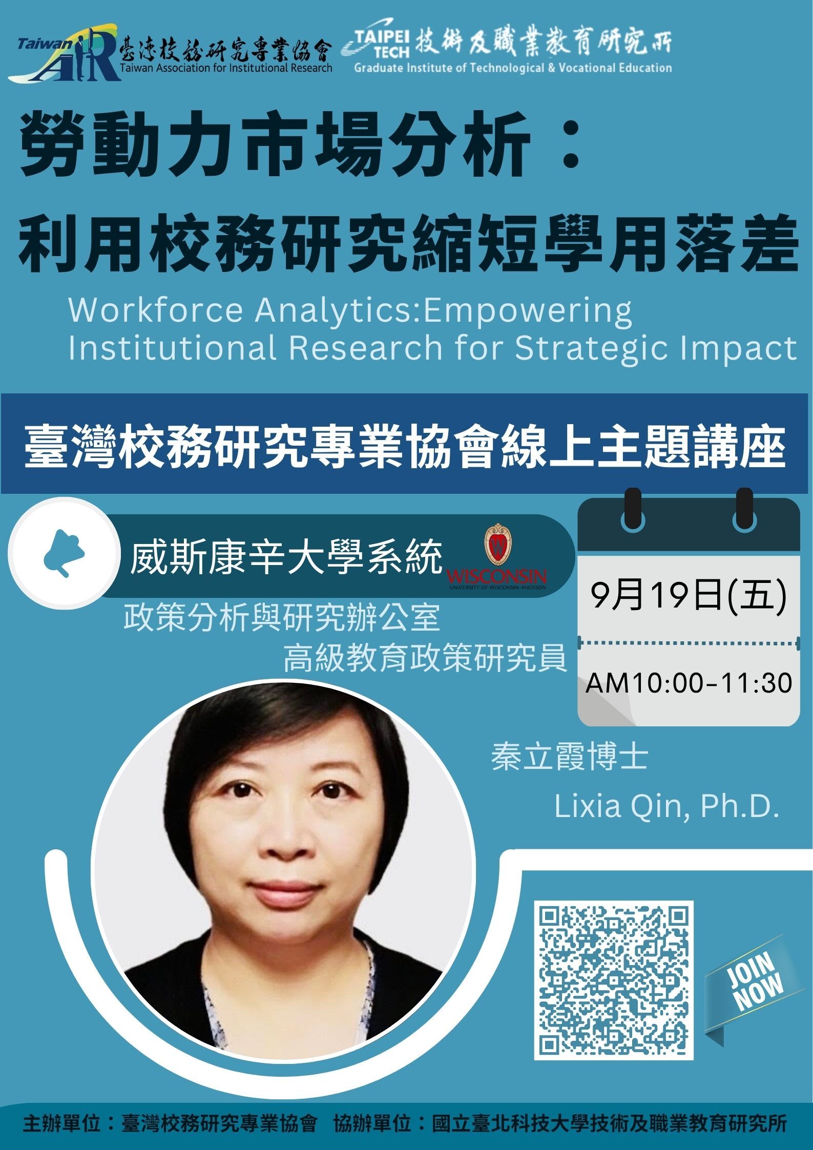 The Taiwan Association for Institutional Research (TAIR) will host an online seminar titled "Labor Market Analysis: Bridging the Education-Employment Gap through Institutional Research" on Friday, September 19, 2025. We cordially invite colleagues to register and attend the event. Details are as follows: